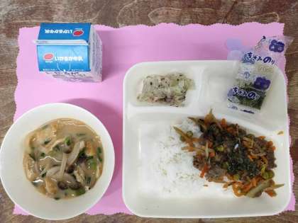 今日のメニューは、牛肉のきんぴらちらし・みそ汁・キャベツの赤じそあえ・牛乳でした。