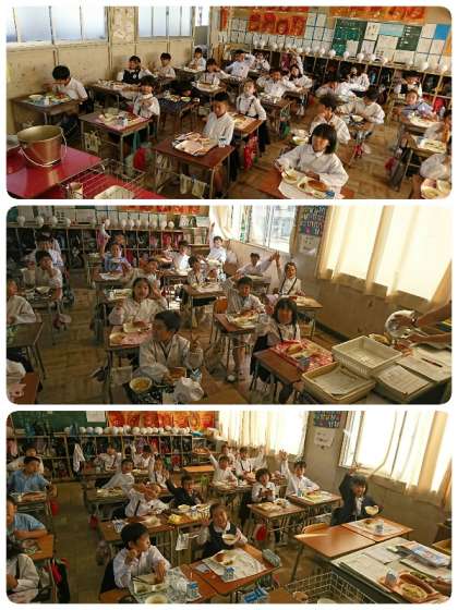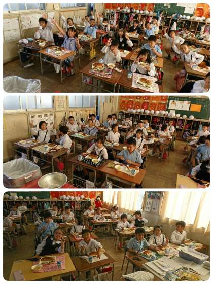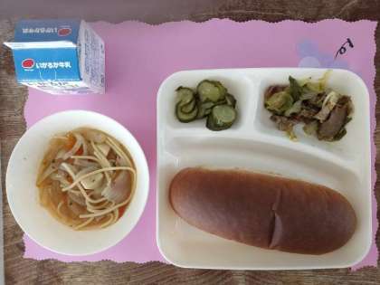 今日のメニューは、牛肉のカレー風味焼き・ほたて貝とトマトのスープスパゲティ・きゅうりのサラダ・パン・牛乳でした。