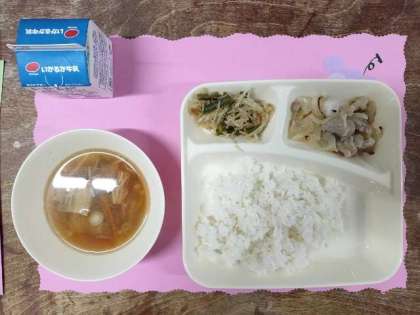 今日のメニューは、鶏肉のゆず塩焼き・ソーキ汁・もやしとさんどまめの甘酢あえ・ごはん・牛乳でした。