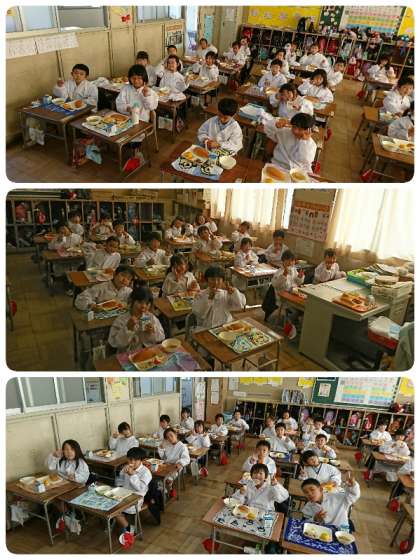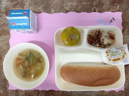 今日のメニューは、なすのミートグラタン・鶏肉と野菜のスープ・みかん・パン・牛乳でした。