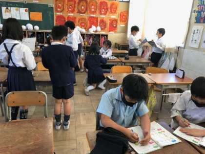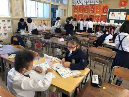 外国語活動で“What food do you like?”を学習しています。友達同士でインタビューをし、“I like〜.”と答えていました。英語で受け答えをすることができました。