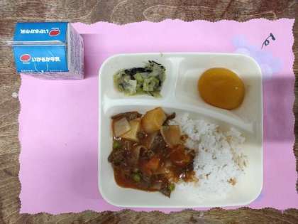 今日のメニューは、ハヤシライス[米粉]・キャベツのひじきドレッシング・黄桃(缶)・牛乳でした。