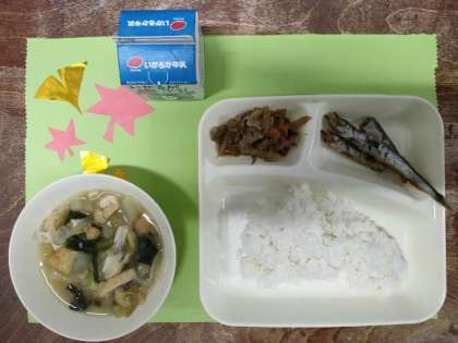 今日のメニューは、焼きししゃも・五目汁・きんぴらごぼう・ごはん・牛乳でした。