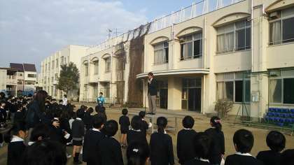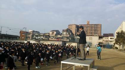 1月26日(月)、本日の児童朝会に住之江区役所の高橋英樹区長が、お話に来られました。区の歴史や区政の根っこを育てているというお話をしていただきました。