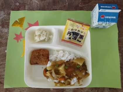 今日のメニューは、カツカレーライス・カリフラワーのピクルス・いり黒豆・牛乳でした。