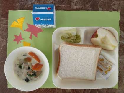今日のメニューは、きのこのクリームシチュー・キャベツのピクルス・りんご・パン・牛乳でした。