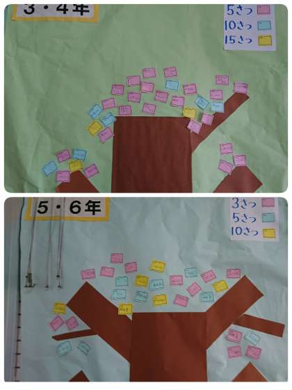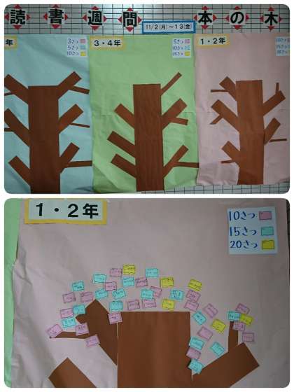 読書週間がスタートして1週間が経ちました。玄関にある「本の木」に、少しずつ葉っぱが増えてきました。1・2年生は、10冊読んだらピンク色、15冊読んだら水色、20冊読んだら黄色のカードを貼ることができます。3・4年生は、5冊読んだらピンク色、10冊読んだら水色、15冊読んだら黄色です。5・6年生は、3冊読んだらピンク色、5冊読んだら水色、10冊読んだら黄色です。学年が上がると本のページ数が増えるので、目標の冊数が違っています。来週も読書週間は続きます。