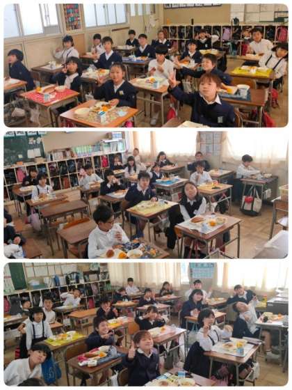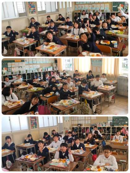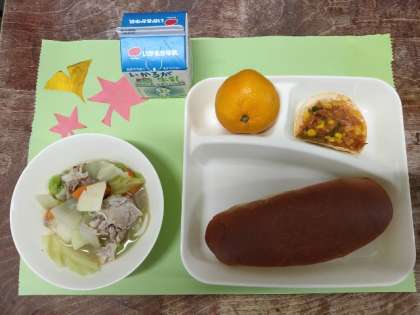 今日のメニューは、豚肉と野菜のスープ煮・変わりピザ・みかん・パン・牛乳でした。