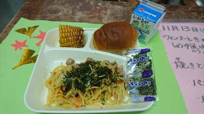 今日のメニューは、ウインナーときのこのしょうゆ風味スパゲッティ・焼きとうもろこし・パン(1/2)・牛乳でした。ウインナーときのこのしょうゆ風味スパゲッティは、にんにくの香りと、醤油の味付けがとてもあっていて、具材のウインナーやきのこ(しめじとしいたけ)もおいしかったです。焼きとうもろこしは、焼き加減がちょうどよく香ばしくておいしかったです。今日もおいしくいただきました。