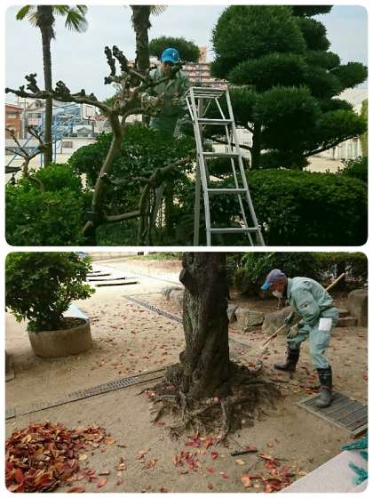 管理作業員さんが、築山のサルスベリの木の手入れをしてくれていました。カイガラムシがついてとても弱っているので、枝をカットしてくれました。元気に復活してほしいです。(^^;)