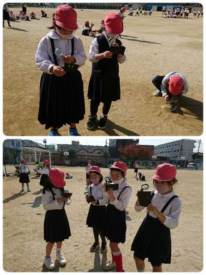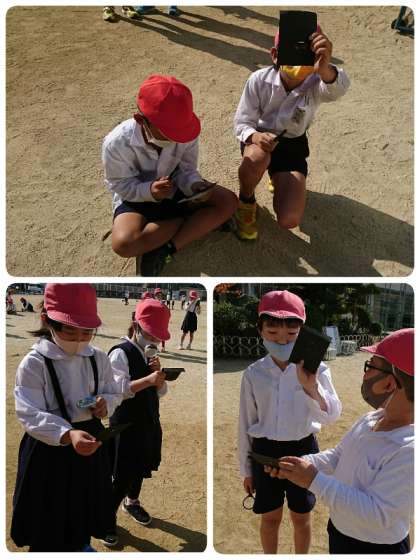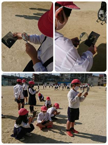 4時間目に3−1の子ども達が、運動場で「光あつめ」をしていました。今日はポカポカ陽気で、実験にはもってこいのお天気です。子ども達は、虫メガネと黒い画用紙を上手に扱って光の点ができるだけ小さくなるように工夫していました。画用紙から煙がもくもく。すごくうれしそうに見せに来てくれました。光のエネルギーってすごいですね。