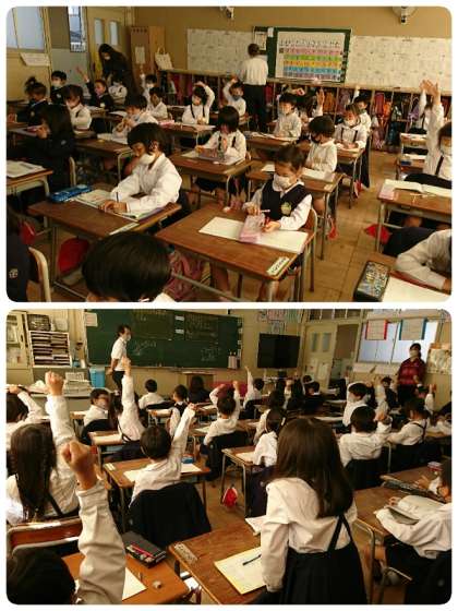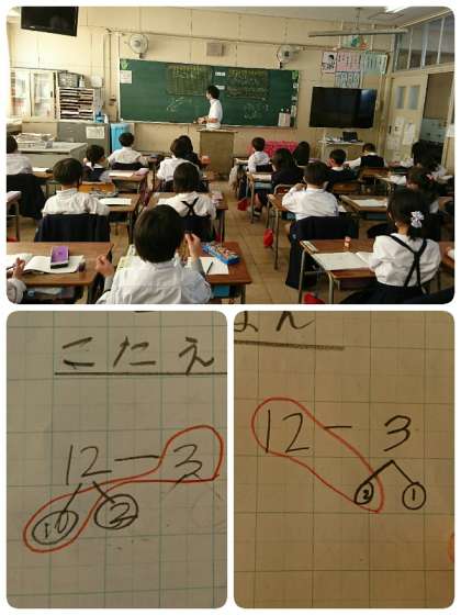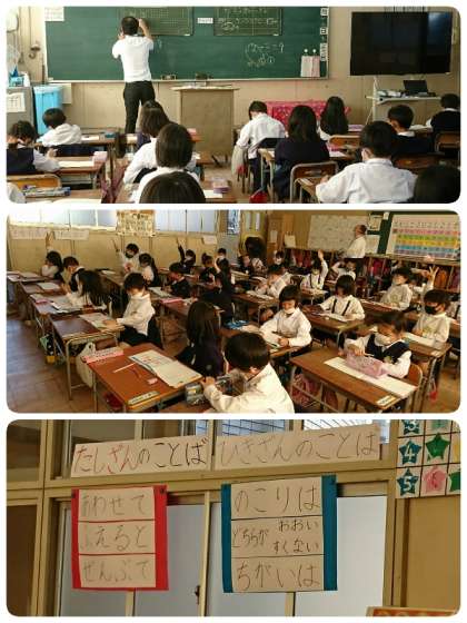 4時間目、算数の公開授業を行いました。今日の学習内容は、繰り下がりのあるひき算で、「12−3」の計算の仕方を考えました。12を10と2に分けて計算する方法と、3を2と1に分けて計算する方法で計算していました。友達の意見をしっかり聞いて、ハンドサインの使い方もきちんとできていました。見に来ていただいた先生からもたくさんほめてもらいました。