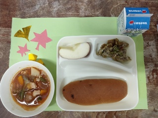 今日のメニューは、豚肉のカレー風味焼き・ケッチャップ煮・りんご・パン・牛乳でした。