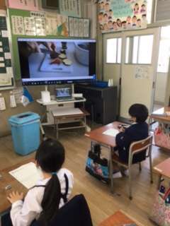 以前に収穫したサツマイモの調理過程を大型テレビで観察した後、実際に食べてみました。