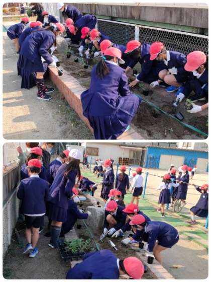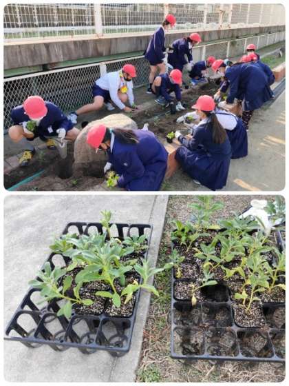 栽培委員が、長居公園で育てられた花の苗を花壇に植替えました。