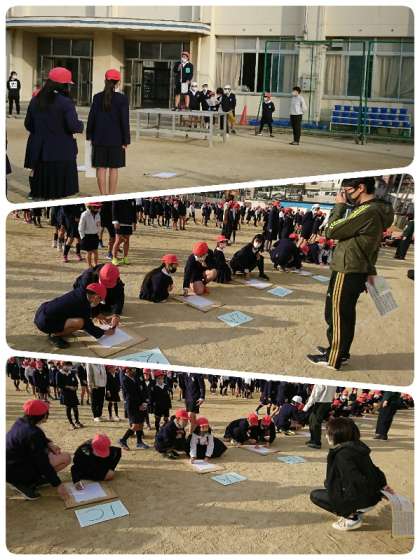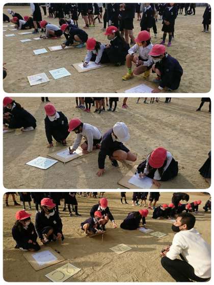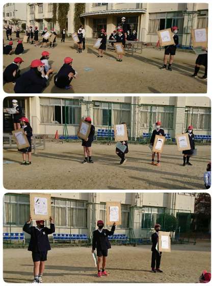 今日のニコニコ集会は、「似顔絵リレー」でした。各グループ2人ずつ出てきて、担当の先生の似顔絵を描いていきます。マスク⇒目⇒まゆ⇒りんかく⇒耳⇒かみの毛⇒先生の名前の順で次々に交代して描きました。画用紙のどのあたりにどんな風に描いたらよいのか、ペアの高学年が下級生にアドバイスをしていました。似顔絵は玄関ホールに掲示します。
