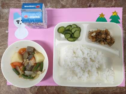 今日のメニューは、鶏肉と野菜の煮もの・じゃこ豆・あっさりきゅうり・ごはん・牛乳でした。