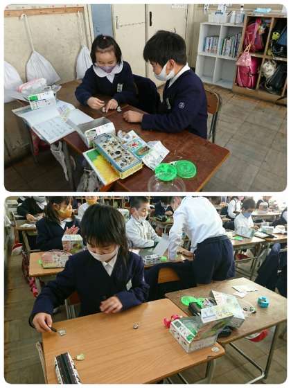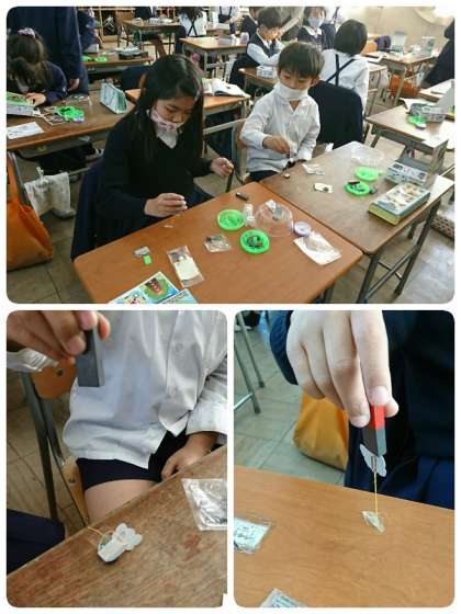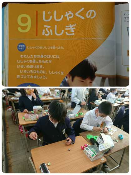 理科の学習で、磁石の実験をしていました。磁石の不思議な力(磁極によってくっつく・しりぞけるなど)を学習してから、その力を利用したおもちゃを作っていました。できあがったおもちゃで、隣のお友達と一緒に楽しそうに遊んでいましたよ。