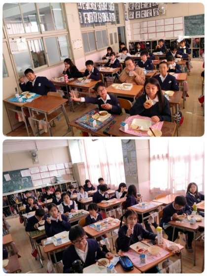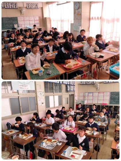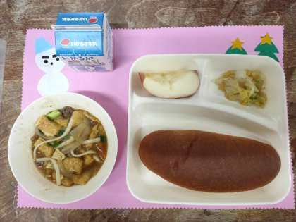 今日のメニューは、カレーうどん・はくさいのおひたし・りんご・黒糖パン・牛乳でした。カレーうどんは、牛肉がたくさん入っていてボリュームがありました。おかわりする子どもがたくさんいました。はくさいのおひたしは、味付けはさっぱりしていて白菜の甘みがありおいしかったです。りんごは、サクサクした食感で甘かったです。今日もおいしくいただきました。