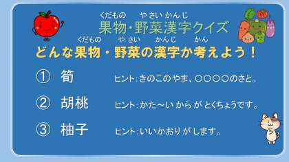 登校時「果物・野菜漢字クイズ」をヒントを見ながら考えている子どもが何人もいます。