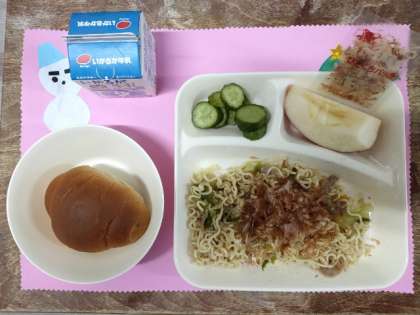 今日のメニューは、和風やきそば・きゅうりの甘酢あえ・りんご・パン・牛乳でした。