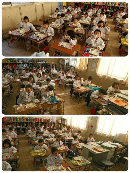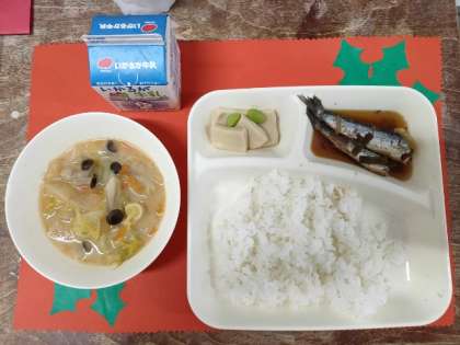 今日のメニューは、いわしのしょうが煮・みそ汁・高野どうふの煮もの・ごはん・牛乳でした。