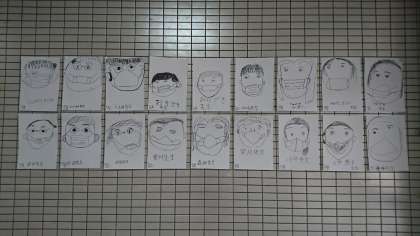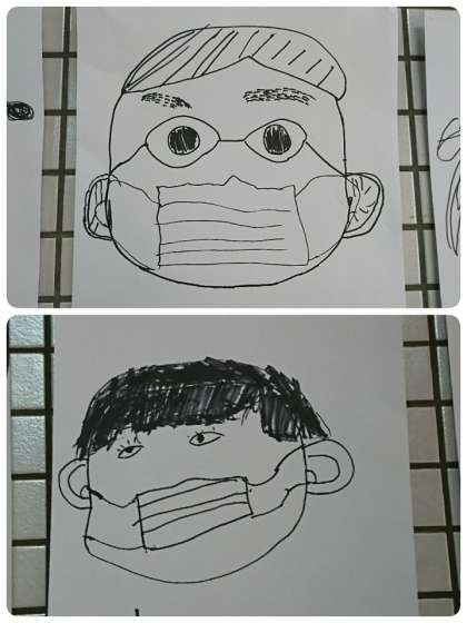 ニコニコ集会、似顔絵リレー3回目。昨日の似顔絵を玄関ホールに掲示しました。登校してきた子ども達が、さっそく見ていました。高学年が最後にマスクの紐などを調整してくれて完成した似顔絵です。