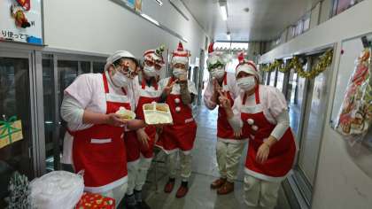 子ども達が給食室に行くと、5人のサンタさん(給食調理員さん)が出迎えてくれました。子ども達は大喜び\(^o^)/