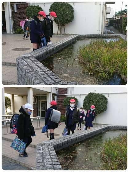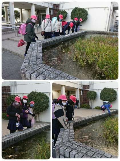 今日は、今季1番の寒さになりました。学校の正門横のめだか池が分厚い氷でおおわれていました。登校してきて、メダカ池が凍っていることに気づいた子ども達。「わぁ、凍ってる!」「結構分厚いなぁ。」など、興味津々でのぞき込んでいました。これから寒さも一層厳しくなります。体調管理に気をつけてお過ごしください。