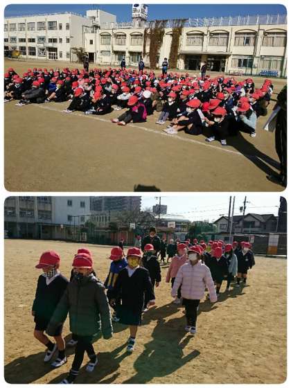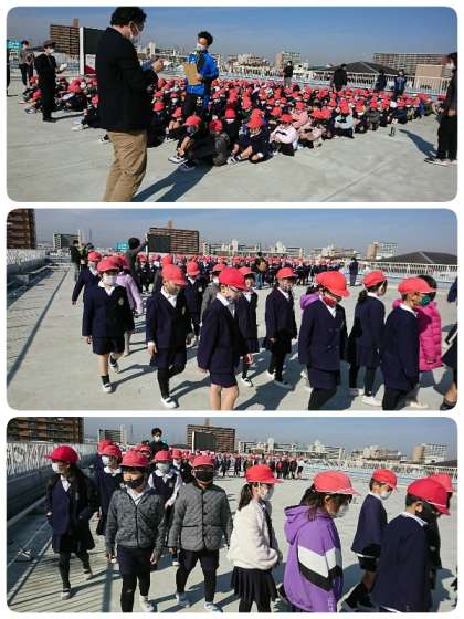 それから津波を想定して講堂棟の屋上に2次避難をしました。移動している間もみんなとても静かで、落ち着いて行動できていました。寒さを心配して防寒対策もしていましたが、今日は比較的ぽかぽかとしていたのでほっとしました。