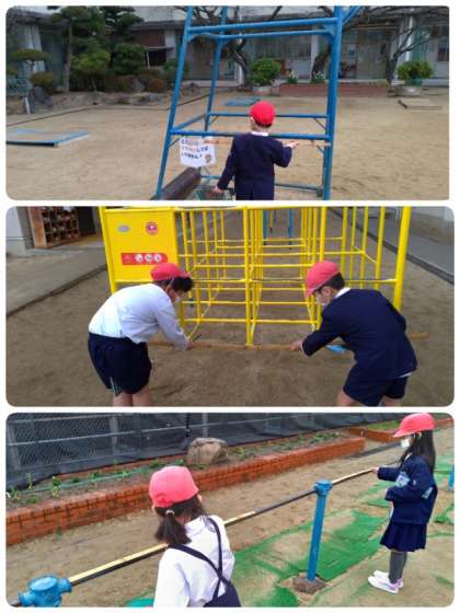 運動場の鉄棒やバスケットゴール、ジャングルジムなど様々なものを調べていました。