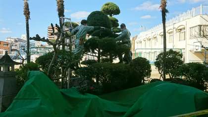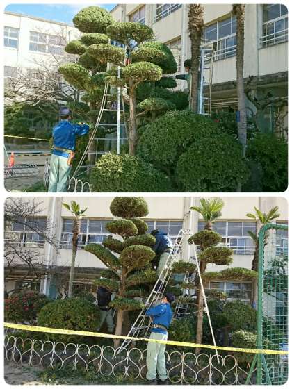 今日は、築山の樹木をきれいさっぱりにしてくれました。池に葉っぱや枝が落ちないようにシートも敷いて作業されていました。日々、学校の樹木がきれいに整えられていきます。