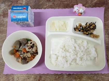 今日のメニューは、筑前煮・ひじき豆・だいこんのゆず風味・ごはん・牛乳でした。