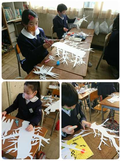 1月14日のホームページで、3−2の「モチモチの木」の版づくりの紹介をしました。5時間目に教室の様子を見に行った時に、以前のモチモチの木が大生長していました。太い幹に枝がいっぱいついて、ぐんぐん力強くなっていました。子ども達も自慢げに見せてくれました。