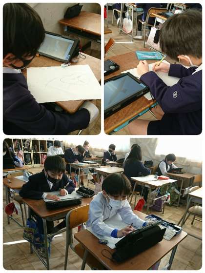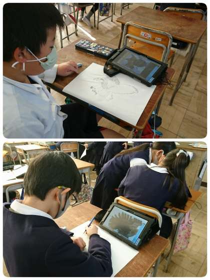 その後、4−3の学級でも、版づくりの下書きをしていました。タブレットでインターネット検索。4年生は題材を鳥にするそうです。大空を羽ばたく鳥・枝にとまっている鳥・クリクリの目をしたフクロウなど、写真を拡大して細かなところまでしっかり描いていました。3年生は紙版画、4年生は木版画に取り組みます。