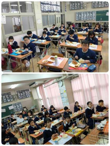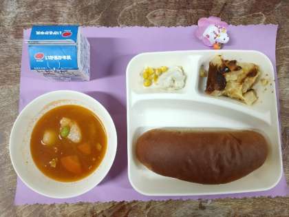 今日のメニューは、豚肉と野菜のケチャップ煮・カリフラワーのピクルス・桃のクラフティ・黒糖パン・牛乳でした。豚肉と野菜のケチャップ煮は、具材のニンジンとエダマメの色が鮮やかで、ケチャップとブイヨンの味付けがよく合っていました。カリフラワーのピクルスは、さわやかな酸味で甘みもありおいしかったです。桃のクラフティは、サクサクと焼きあがっていてとても香ばしかったです。今日もおいしくいただきました。