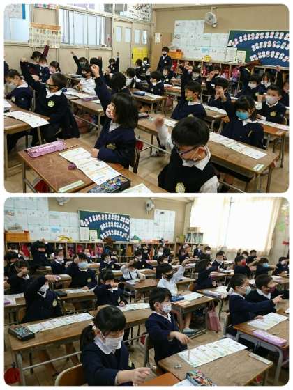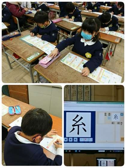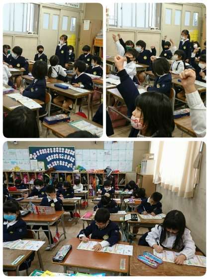 1年生が漢字の「貝」と「糸」の学習をしていました。読み方や書き順、使い方など国語のデジタル教科書を見ながら、一つ一つ確認して練習していきます。発表には、たくさんの手があがります。発表する子をしっかり見て話を聞くことができていました。そして発表の内容について賛成・付けたし・反対などをみんながハンドサインで答えます。発表の仕方も聞き方もとても上手にできている様子を見て感心しました。日々の学習の積み重ねがあらわれています。