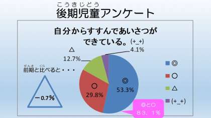 アンケートの「自分から進んであいさつができている」の項目の結果は、残念ながら前期と比べてほんの少し下がってしまいました。このグラフを見てみましょう。二重丸の「よくできている」が53.3%、丸の「だいたいできている」と答えた人は29.8%で、合わせて83.1%でした。前期と比べて−0.7%という結果です。