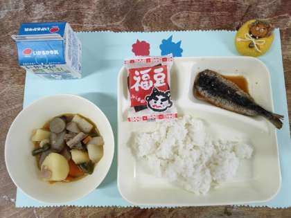 今日のメニューは、節分にちなんで、ごはん、牛乳、いわしのしょうがじょうゆかけ、含め煮、いり大豆でした。