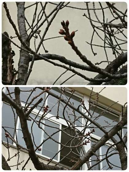 理科室前のカンヒザクラのつぼみが、ほんの少しだけ膨らんできました。先のほうがうっすらピンク色です。花は、とてもきれいな濃いピンク色です。花が咲くのはまだしばらく先ですが、その頃には野鳥が花の蜜を吸いにやってきます。つぼみの変化の様子は、またお知らせします。