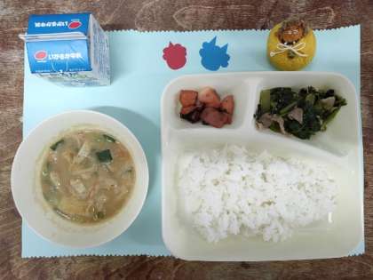 今日のメニューは、泉だこのやわらか煮・みそ汁・こまつなの煮びたし・ごはん・牛乳でした。
