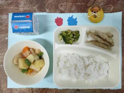 今日のメニューは、きびなごてんぷら・一口がんもとじゃがいもの煮もの・ブロッコリーのごまあえ・ごはん・牛乳でした。