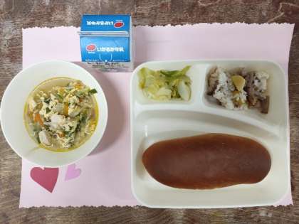 今日のメニューは、中華おこわ・卵スープ・キャベツとピーマンのいためもの・黒糖パン・牛乳でした。中華おこわは、ほくほくの栗がゴロゴロ入っていて味付けも最高!とってもおいしかったです。卵スープは、卵がふんわりと仕上がって色どりも鮮やかでした。キャベツとピーマンのいためものは、キャベツが甘くてやわらかかったです。今日もおいしくいただきました。