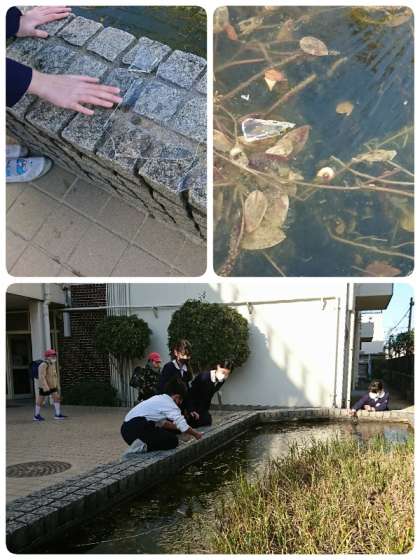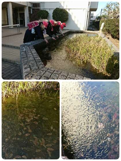 久しぶりにめだか池が凍りました。登校してきて、めだか池が凍っていることに気づいた子ども達がすぐにのぞき込んでいました。この寒い中でも腕まくりをして氷をさわっている子もいました。こんな時の子ども達の表情は、本当に生き生きしています。