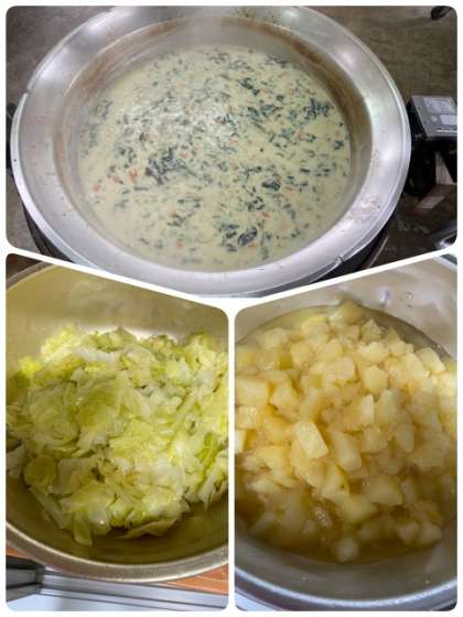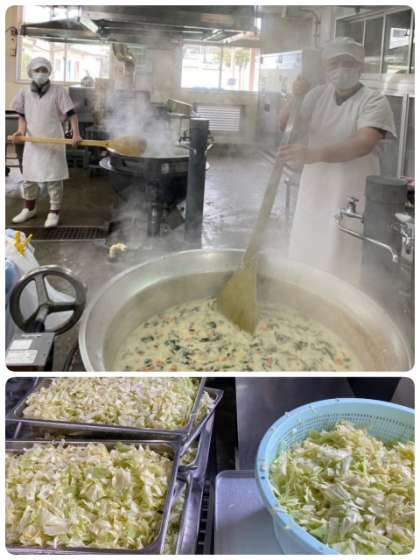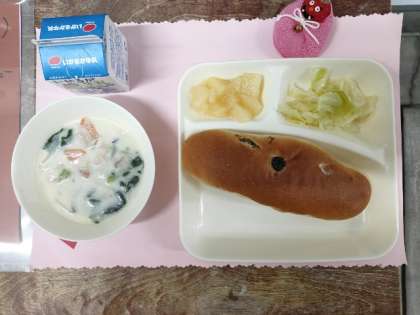 今日のメニューは、ほうれんそうのクリームシチュー・キャベツのサラダ・洋なし(カット缶)・パン・牛乳でした。