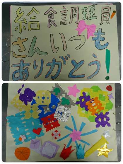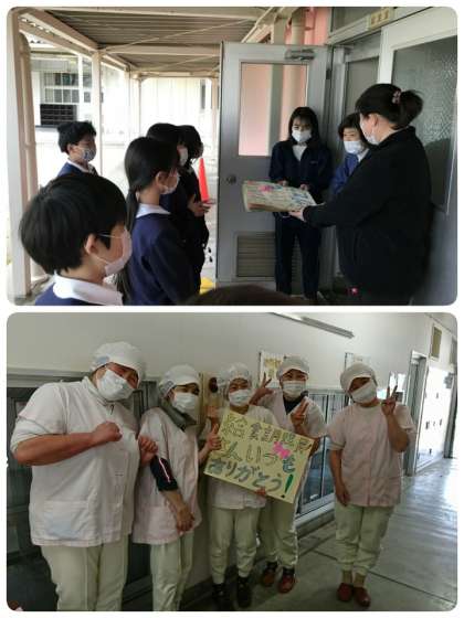 給食委員会の子ども達が代表して、給食調理員さんに「ありがとうのメッセージ」を届けに行きました。給食調理員さんは、みんなでメッセージを読んでくれたそうです。すごく喜んでおられました。「もっともっと子ども達が喜んで、パクパク食べてくれるおいしい給食を作るぞ!!」という気持ちがわいてくるそうです。「いつもおいしい給食を作ってくれてありがとうございます」「給食のカレーライスが大好きです」「毎日残さず食べています」「みそ汁はいいお出汁が出ておいしいです」「調理員さんのおかげで野菜が食べられるようになりました」など、毎日給食を作ってくださっている給食調理員さんに感謝のことばがあふれていました。