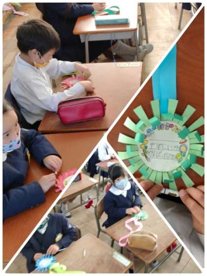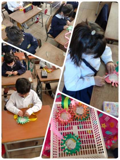 1年生が、卒業おめでとう集会で6年生に贈るメダルを作っています。メダルの中に感謝の気持ちを込めて6年生へのメーッセージを書いていました。