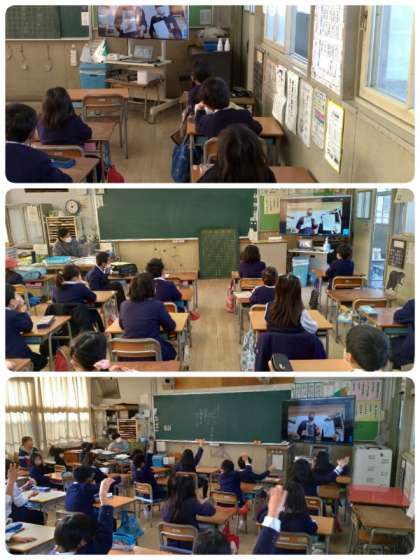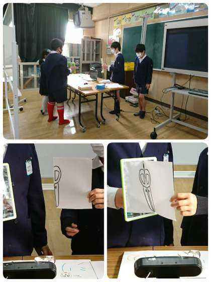 問題を出す集会委員会の子ども達のかけ合いがとっても面白いです。「さあ、今日もはりきってまいりましょう!」からスタート。答えを考える制限時間は5秒。鏡の中の面白い世界をのぞいてみました。