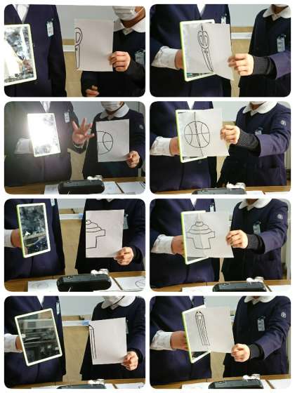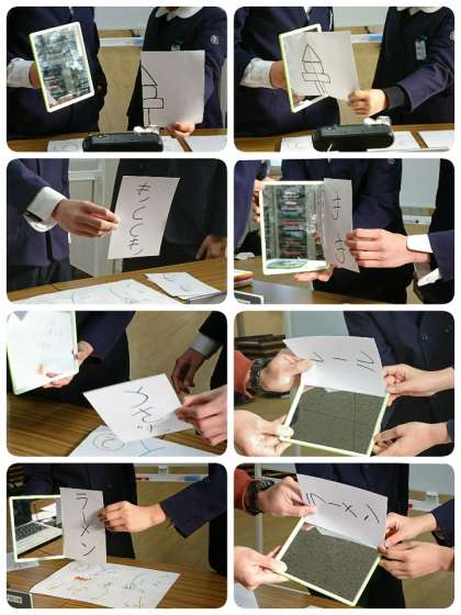 まずは、何の絵かをあてる問題から始まりました。答えは、はさみ・バスケットボール・かがみもち・えんぴつ・おでんでした。次に文字をあてる問題です。答えは、きつつき・もも・とちぎ・くさ。最後の2問は紙の上に鏡を置いて考えるひっかけ問題で、フーラはレールに、ラーメンはルーメンになりました。なかなか難しかったです。