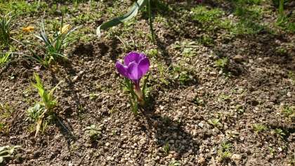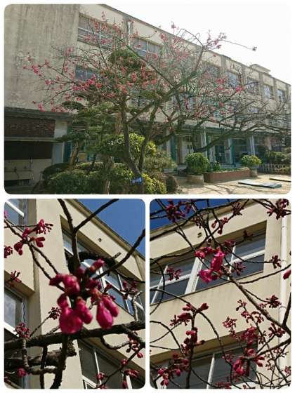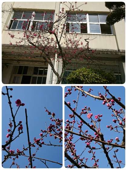 校庭のカンヒザクラとウメの花が開花しました。花だんには紫色のクロッカスも咲きました。スイセンもたくさんつぼみをつけていますので、これから次々と咲き始めます。春はもうそこまで近づいていますね。